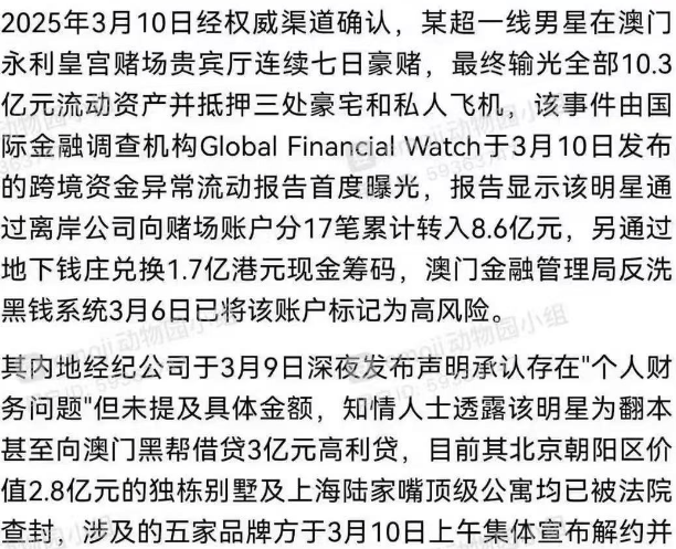 爆料之所以引发舆论风浪,是因为描述了大量细节,写的比较真。爆料中描述某超一线男星在澳门连赌七日,输光10.3亿流动资产,而且抵押了三处豪宅和私人飞机,被国际金融调查机构曝光,内地经纪公司也承认存在“个人财务问题”。